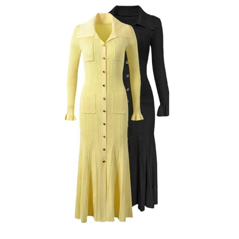 Otoño Invierno Nuevo vestido ajustado de cintura alta elegante de punto con solapa con volantes